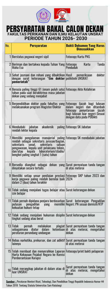 Persyaratan Bakal Calon Dekan FPIK Unsrat Periode 2026-2030 By Ari Rondonuwu | 7 Oktober 2025 | Berita |